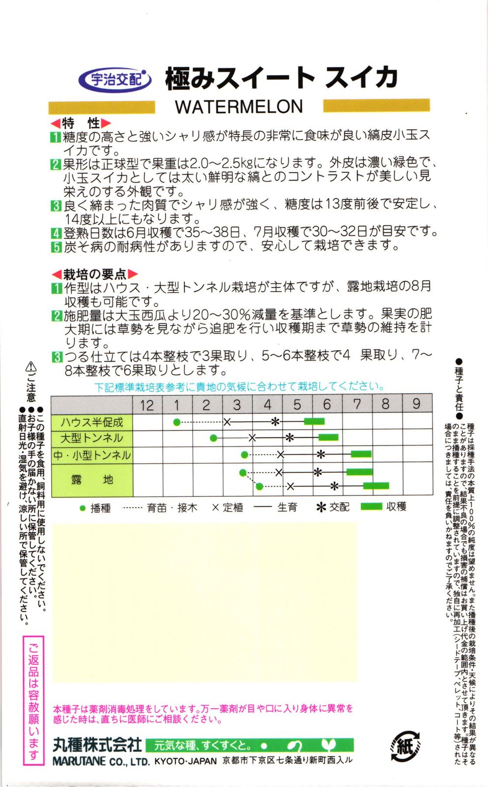 2.施肥量は大玉西瓜より20~30%減量を基準とします。但し、リン酸肥料はやや多い目に施します。果実の肥大期には草勢を見ながら追肥を行い収穫期まで草勢の維持を計ります。