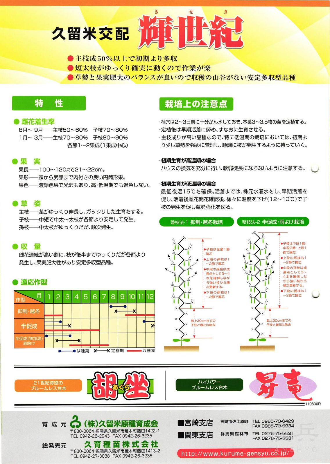【収量】雌花連続が高い割に、枝が後半までゆっくりだが各節より発生し、果実肥大性があり安定多収型品種。