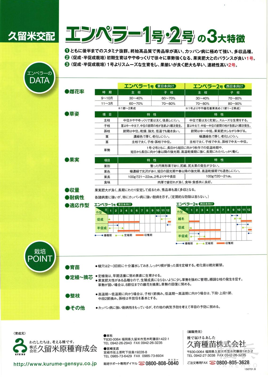 1.ともに後半までスタミナ抜群、終始高品質で秀品率が高い。カッパン病に極めて強い、多収品種。